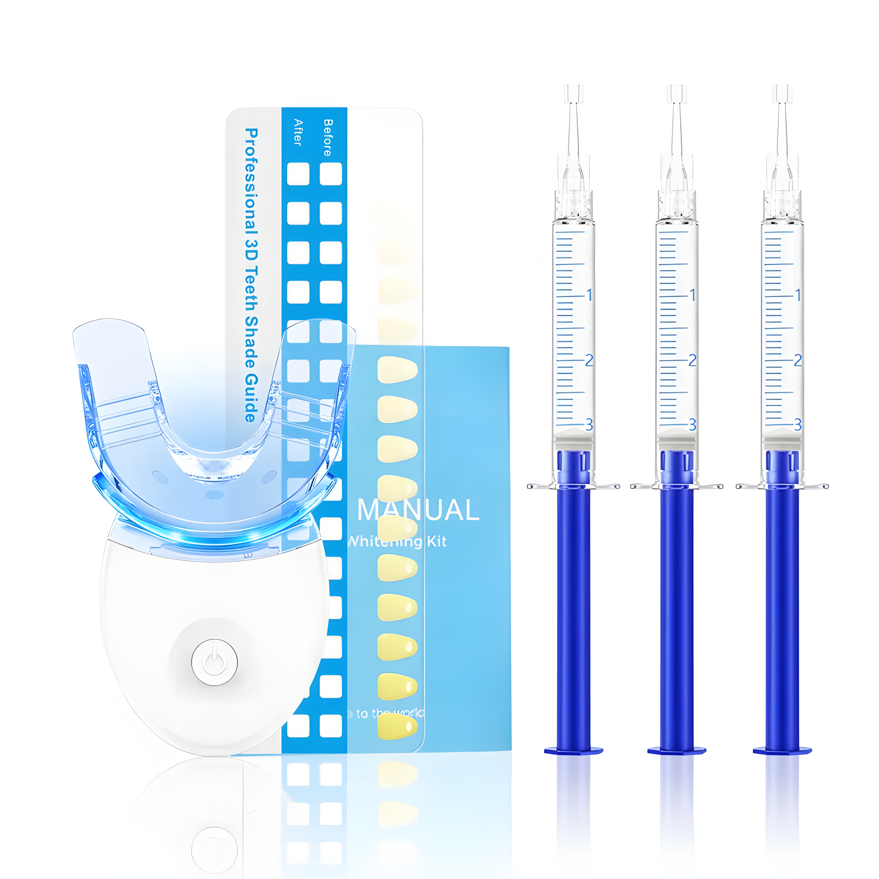 The kit includes three syringes with a total of 9 ml of teeth whitening gel, a double-sided mouth tray with five blue LED lights, and a chart to track your results.